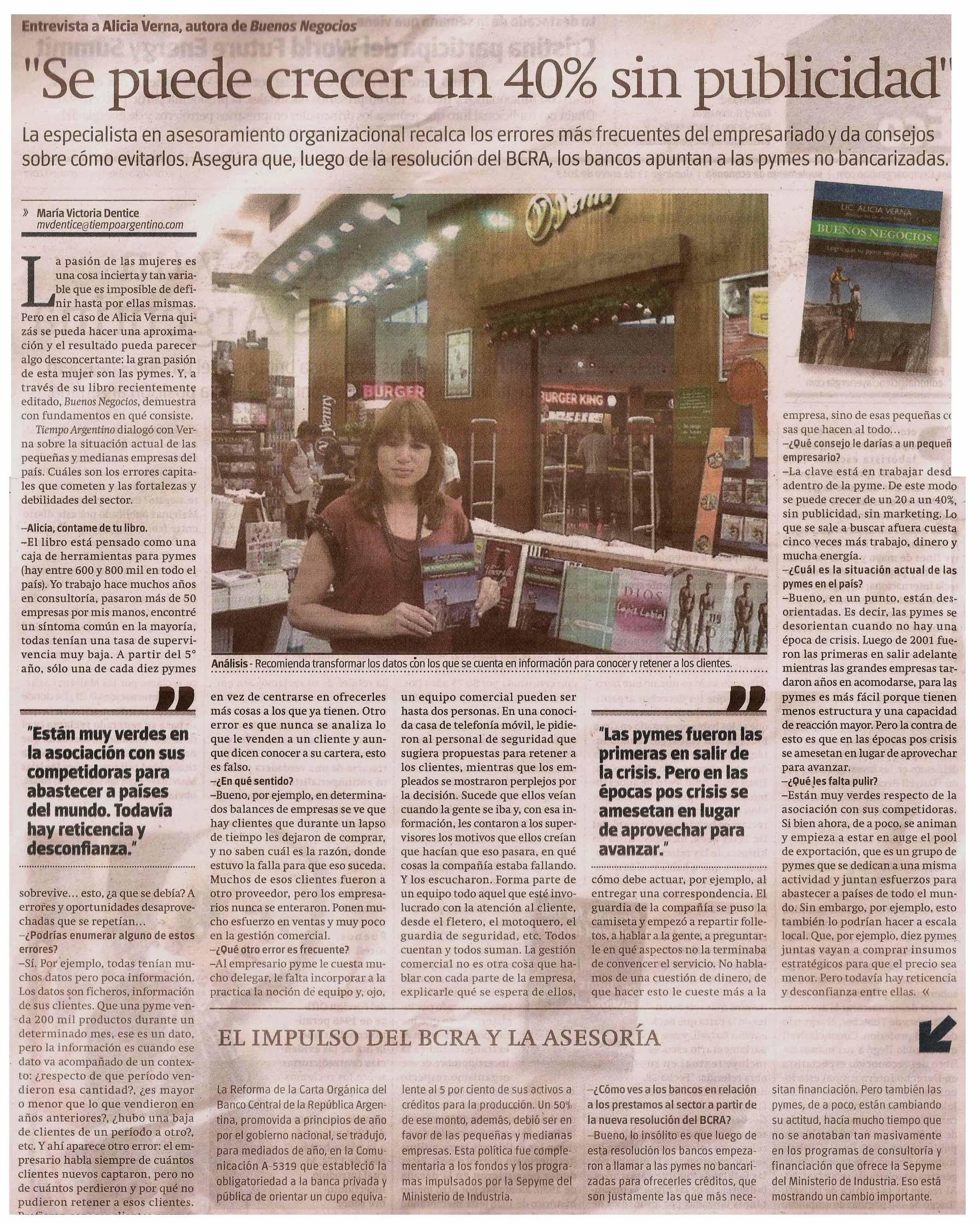 Compartimos la entrevista que le realizaron a la Licenciada Alicia Verna, Autora de Buenos Negocios: Logre que su pyme venda mejor, por el diario Tiempo Argentino: